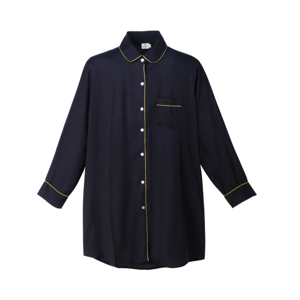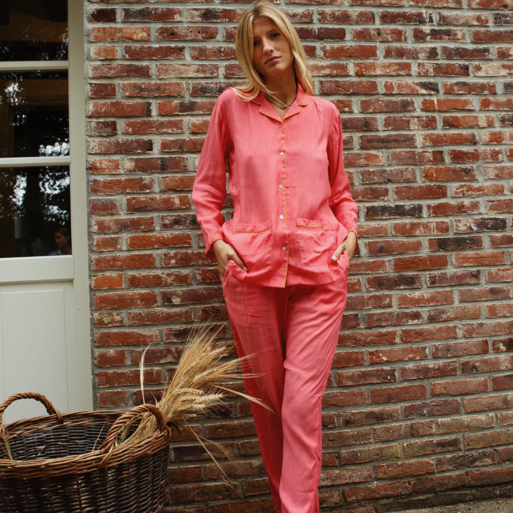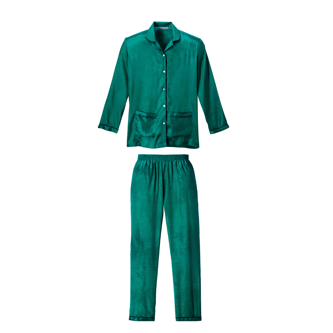 Atraskite Camille pižamą iš medvilnės ir šilko sodrios smaragdo spalvos – puikų pasirinkimą ramioms naktims ar jaukiam poilsiui namuose. Klasikinis siluetas su kontrastiniu apvadu ir priekinėmis kišenėmis tinka įvairiems figūros tipams.